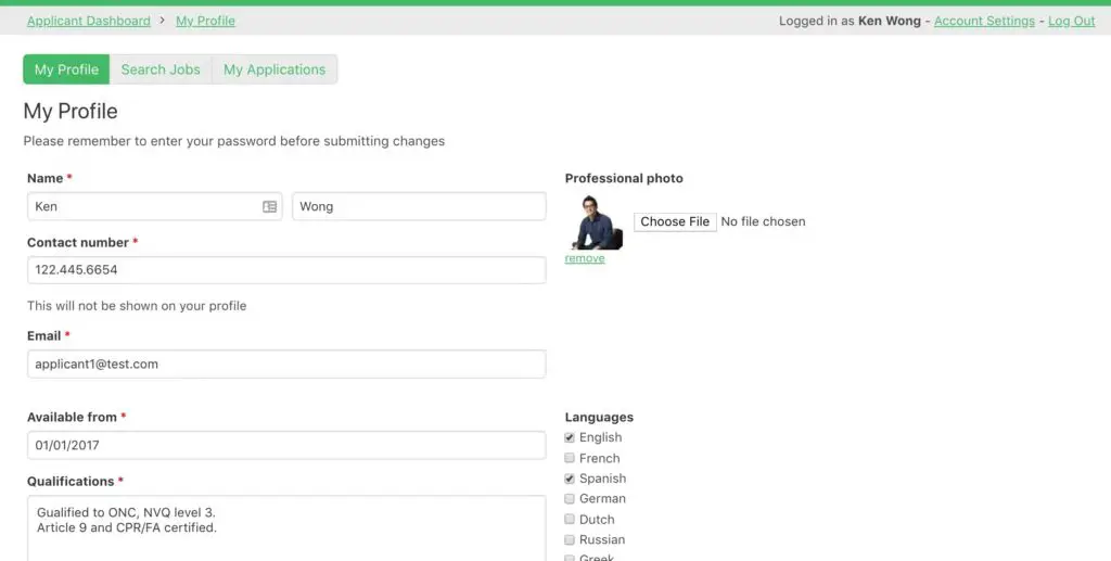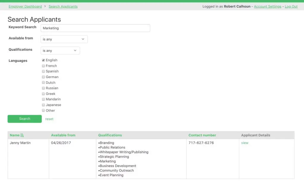 Applicants login and apply for available jobs. They also manage their own profile, which gets sent to the employer with each application.