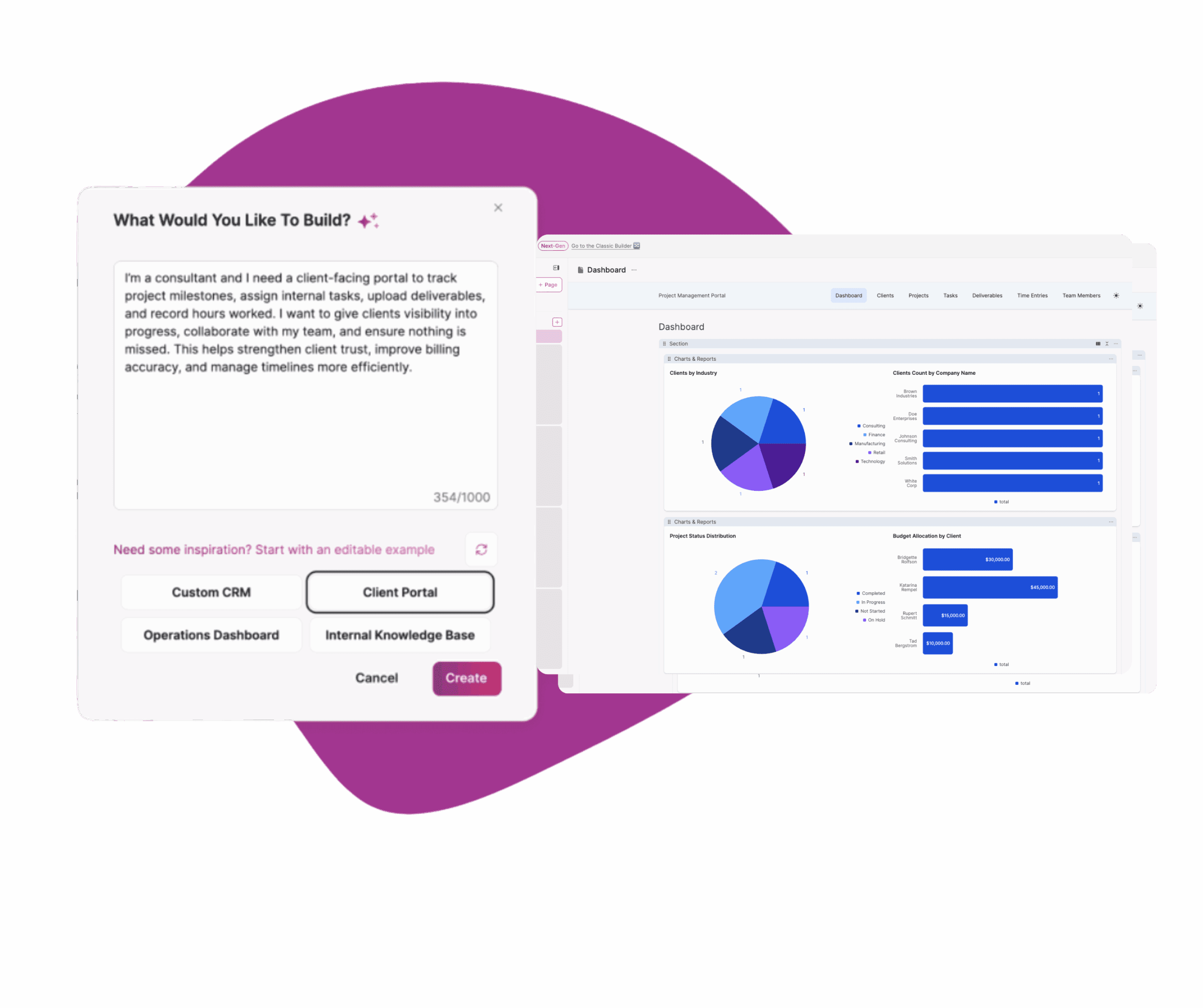 Watch our AI-powered, no-code builder turn your idea into a working web app filled with features, forms, and flows – in minutes.