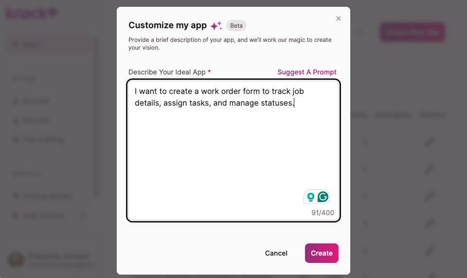 1. Use Knack’s AI Builder to quickly create a functional work order form in minutes.