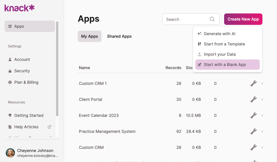 From the Knack dashboard, click + Create New App and select Start from Scratch.
