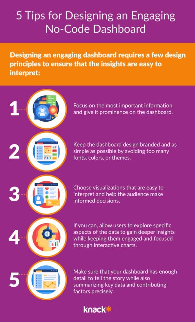 Now that we have covered what no-code builders for dashboards are, the industries they benefit, and how it could benefit your company, let’s get into a few tips on designing an engaging dashboard with no-code tools.