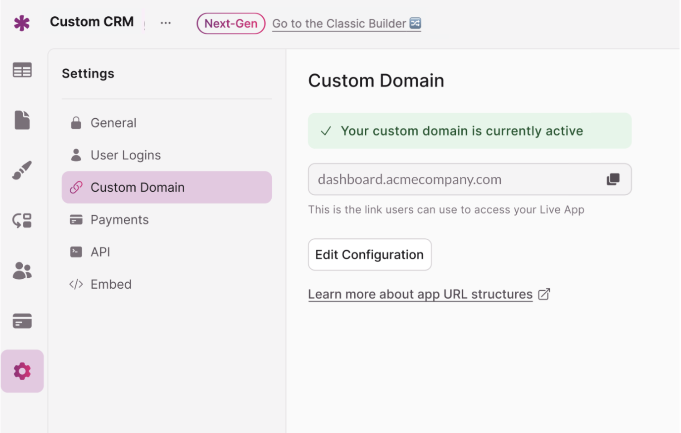 With Knack, connecting a custom domain is straightforward. While your app is typically accessible at a unique Knack URL like apps.knack.com/acmecompany/client-portal, using a custom domain, such as portal.acmecompany.com, offers a fully white-labeled experience that reinforces your brand and builds trust with your users.