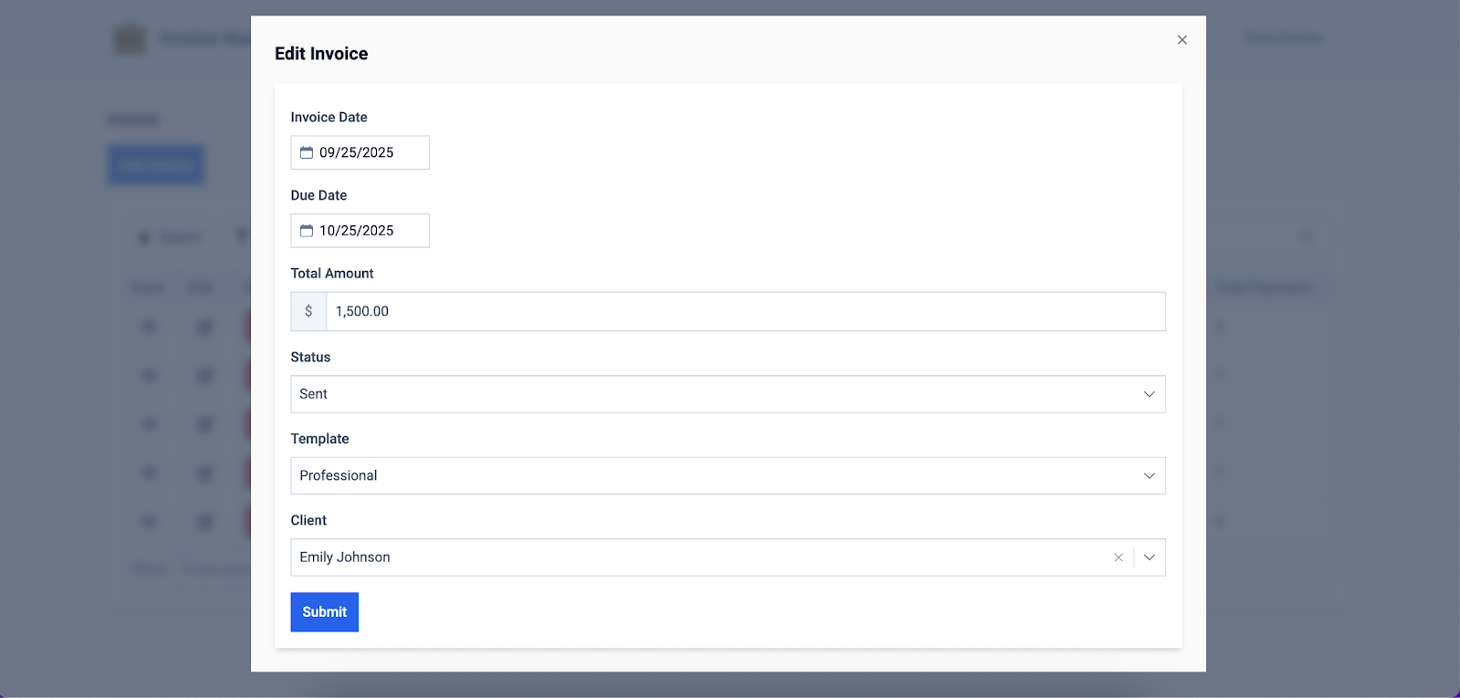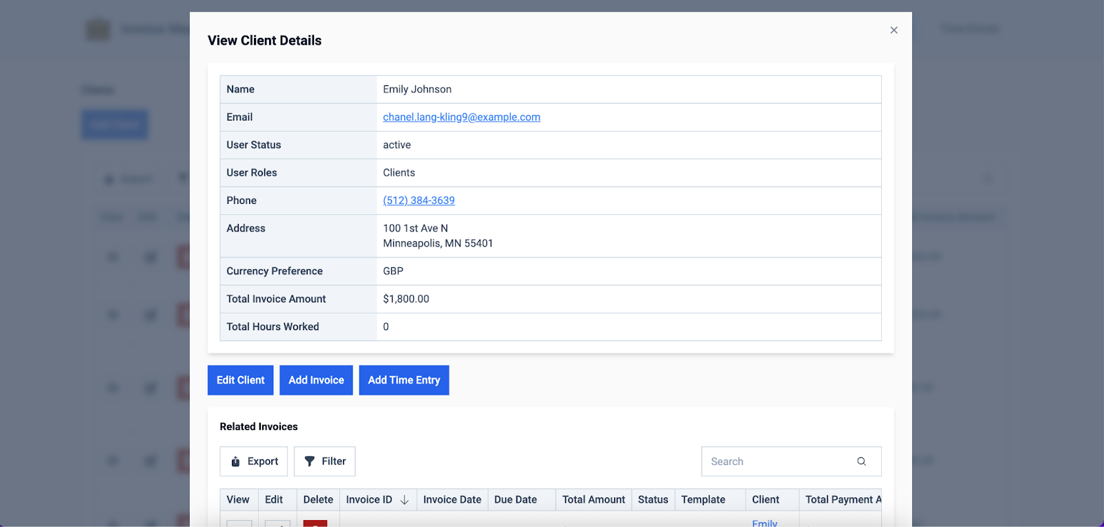 - Custom invoice forms: Automatically pull client and project data to create accurate, professional invoices.