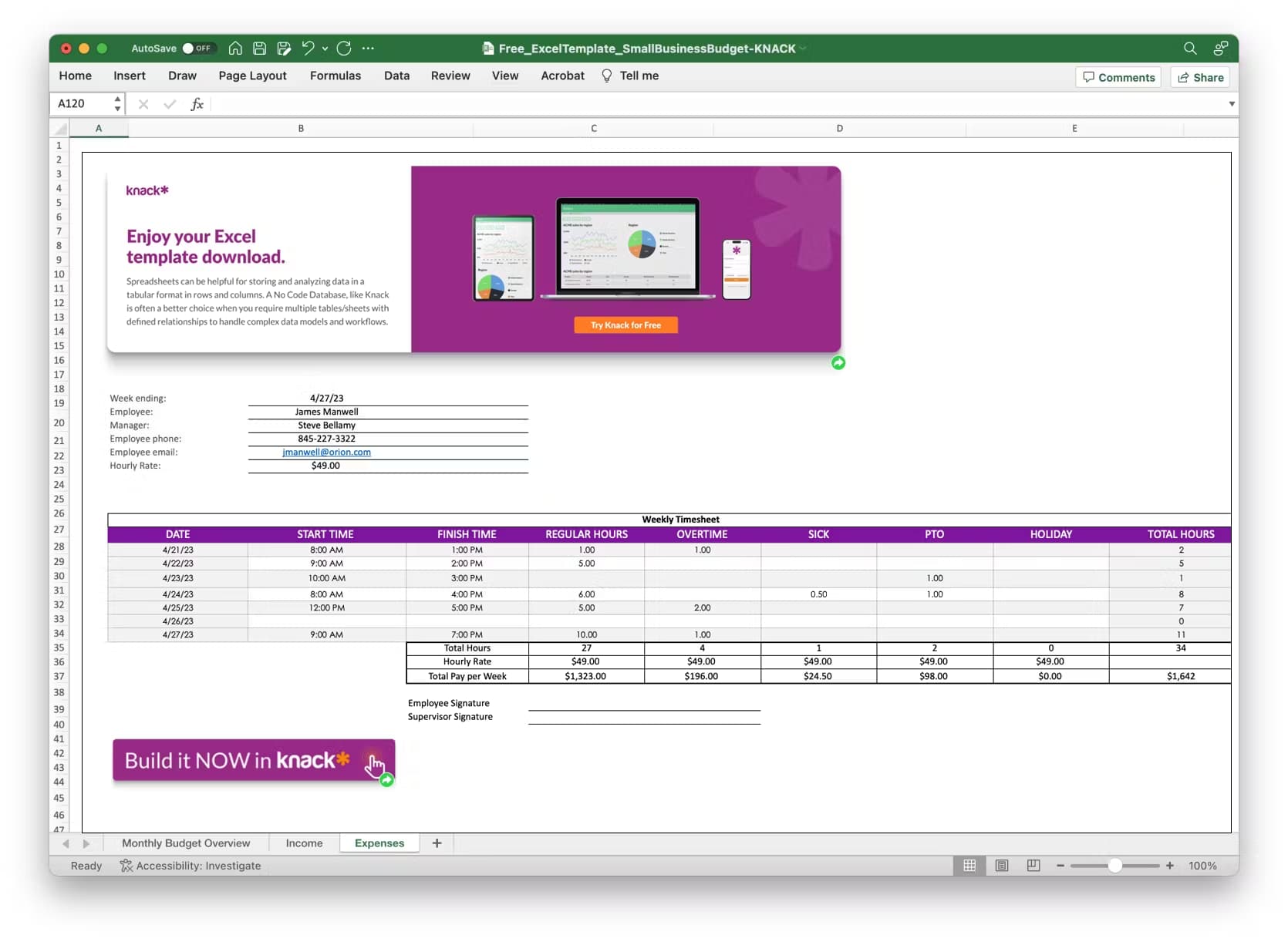 With Knack’s Excel spreadsheet time tracking tool, you can customize a comprehensive timesheet system in just a few minutes. You can even upload it to Google Sheets for a cloud-based, real-time updates.