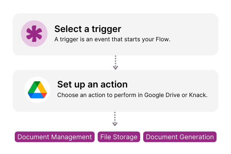 Knack Flows help you automate workflows by connecting your data and actions. A trigger starts a workflow, and an action executes a task based on the trigger.