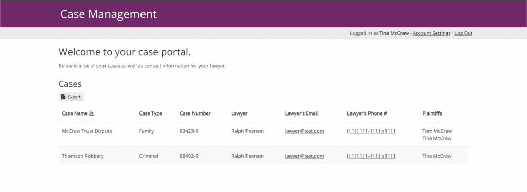 - Customer security – When each plaintiff logs into their portal, they will only see the data connected to their account.