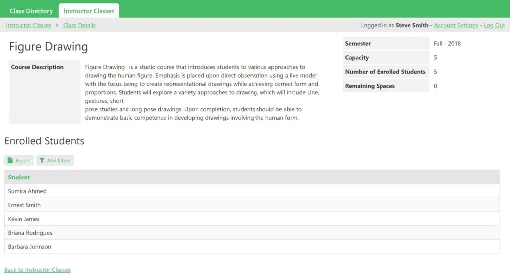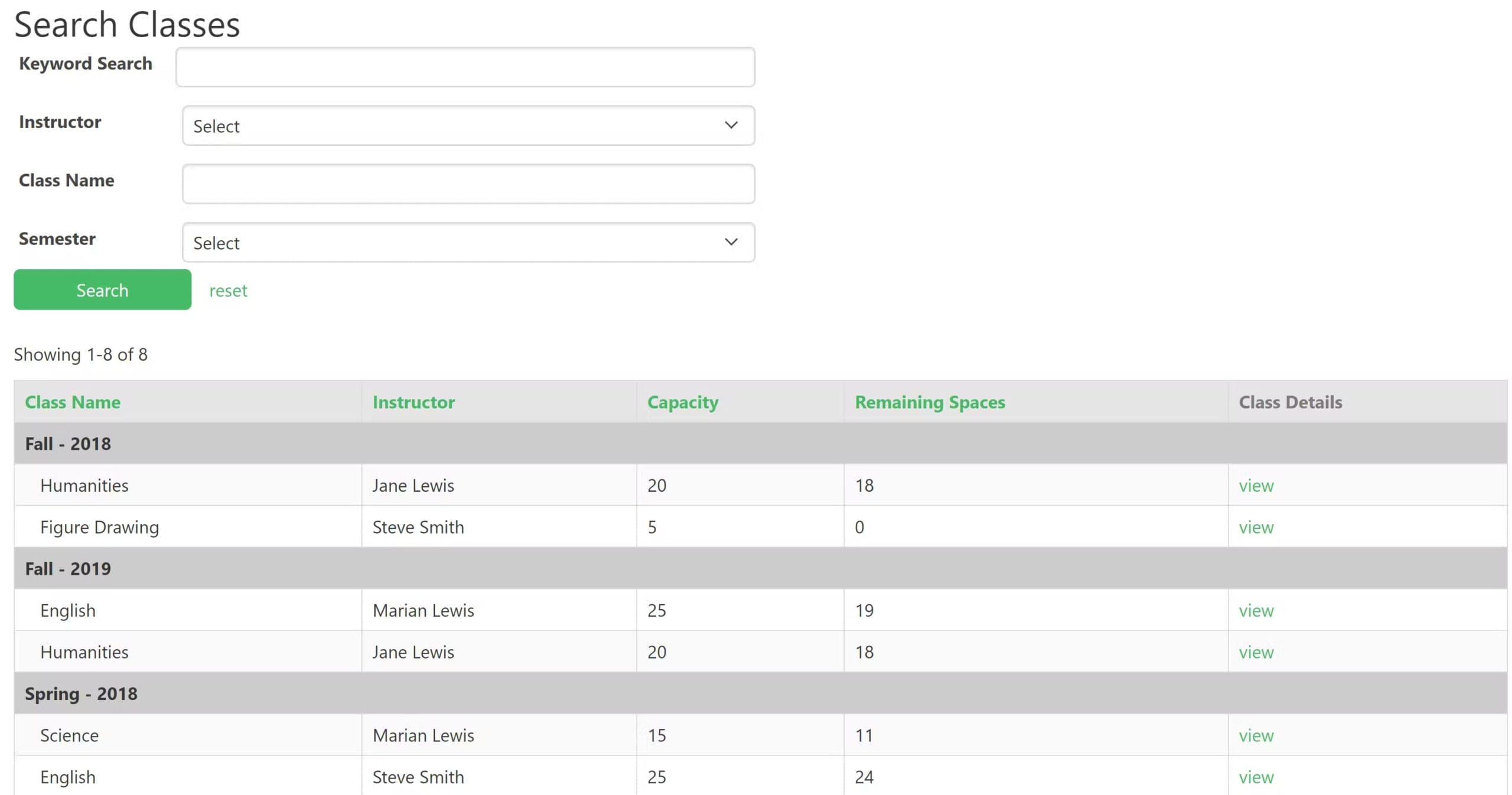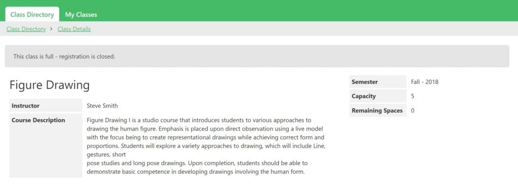 In this class catalog, students can search through the catalog to find classes that interest them. They can then enroll for any classes that are not yet full.