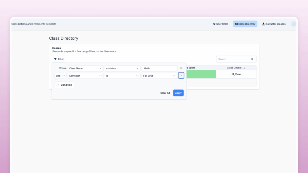 - Save time by building a flexible, no-code Knack app that allows your instructors to easily manage their class offerings without a learning curve.