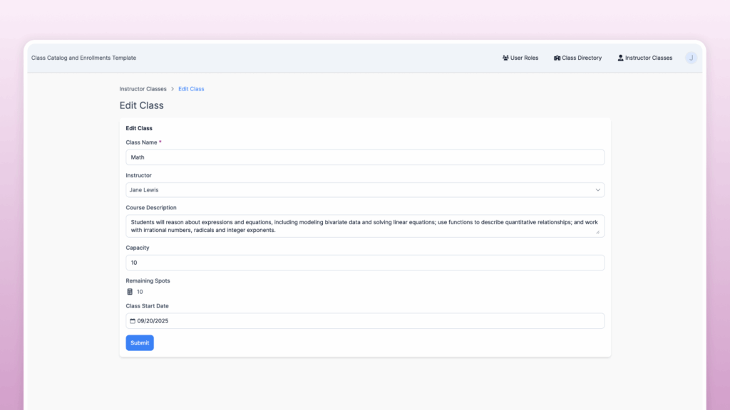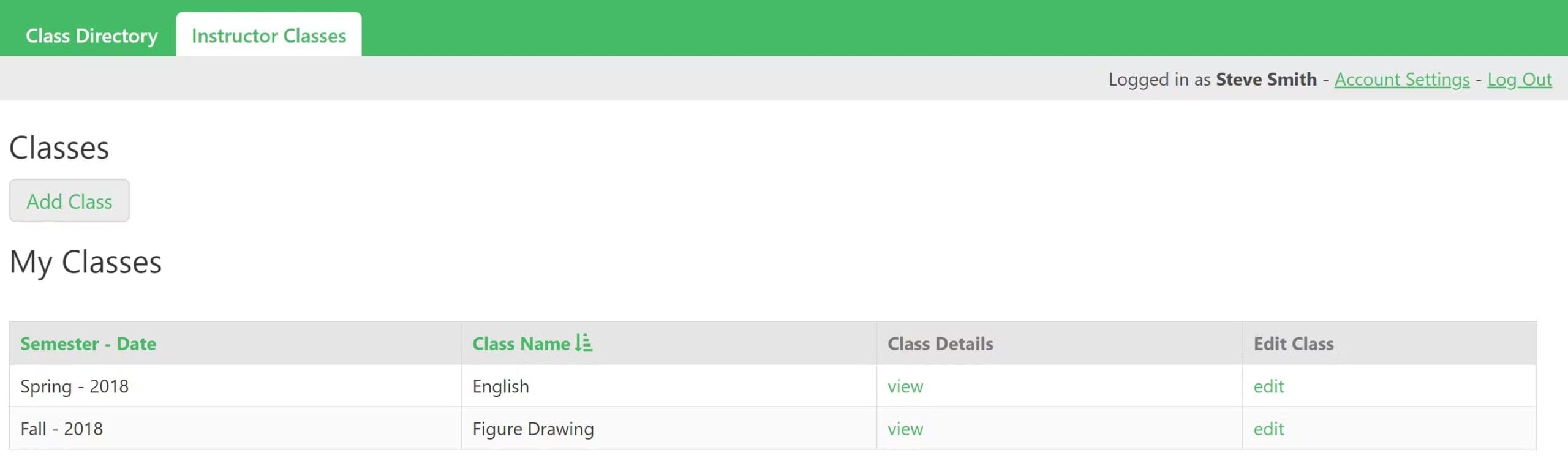 Instructors can manage their own classes – adding new classes with specific capacity limits, viewing and editing existing classes, and viewing enrollments.