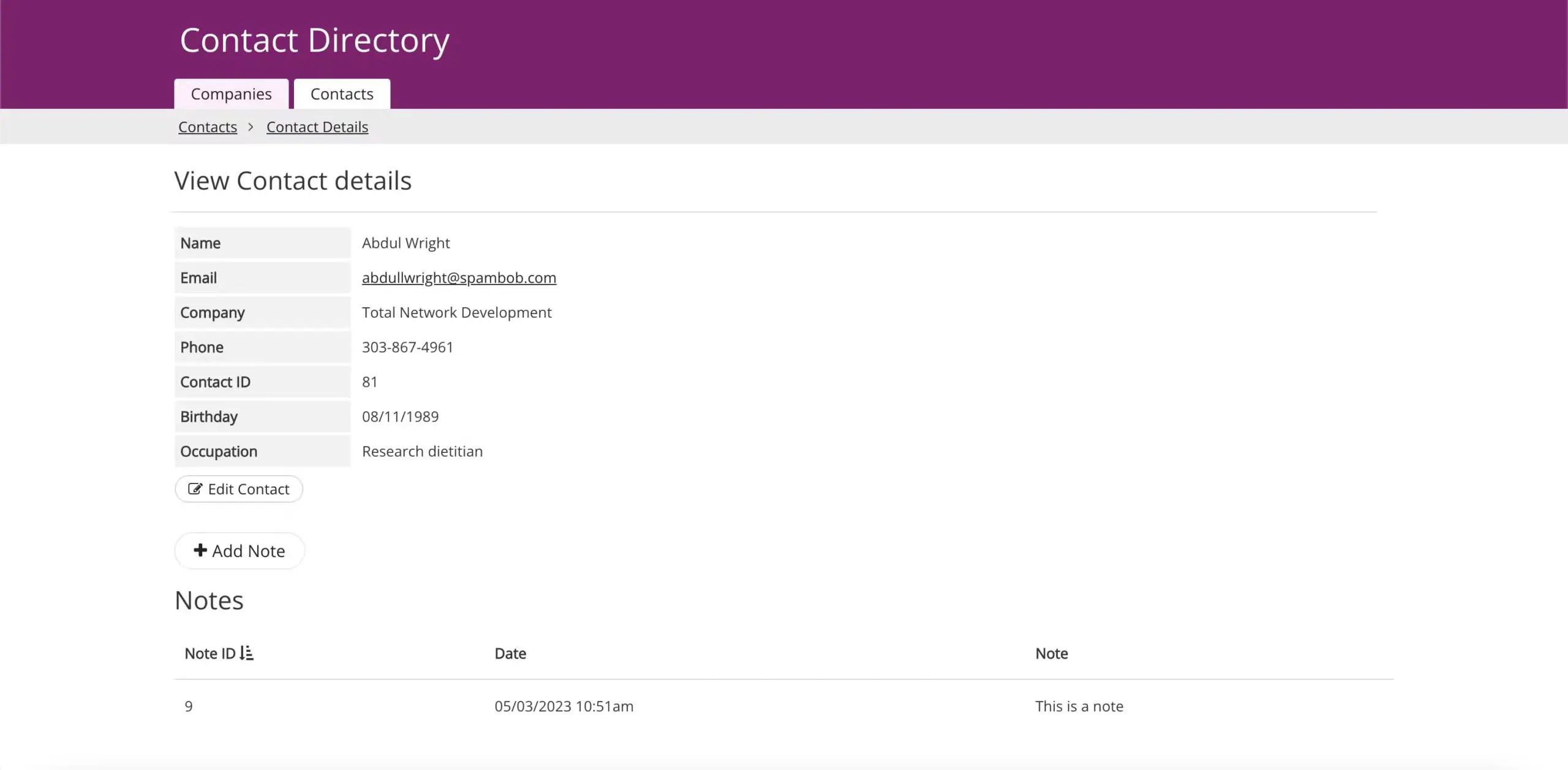 Contact directories give you one central place to store your contacts, group them into companies, and add notes to track your communication.