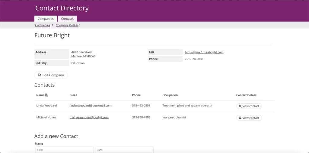 There are many options for expanding the functionality of a contact directory, such as building into a larger CRM or marketing management app.