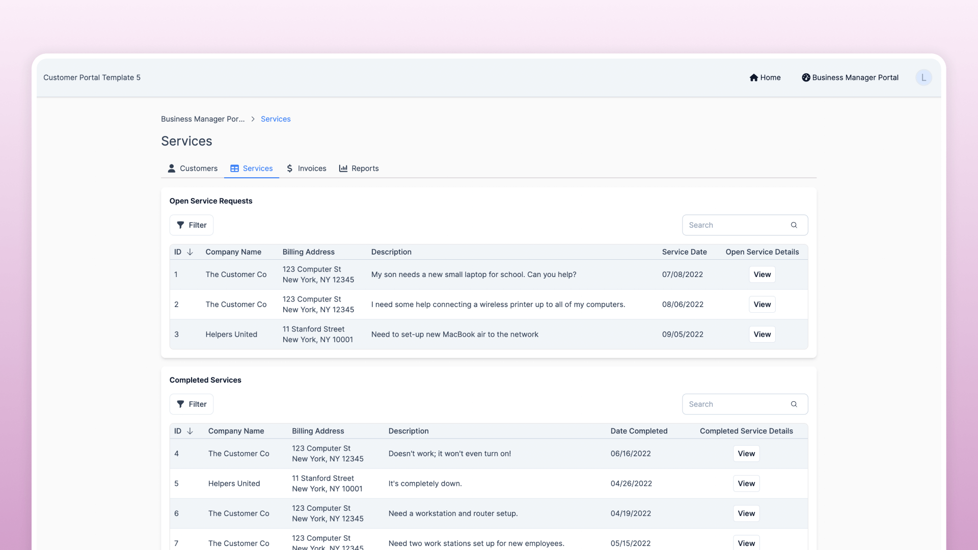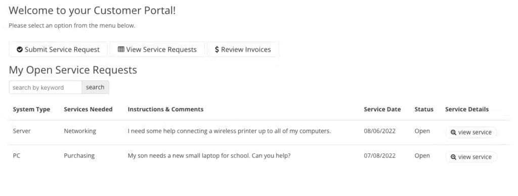 Each customer has a unique login that allows them to securely access only their customer account data, such as service requests, past services, and invoices, ensuring data privacy.