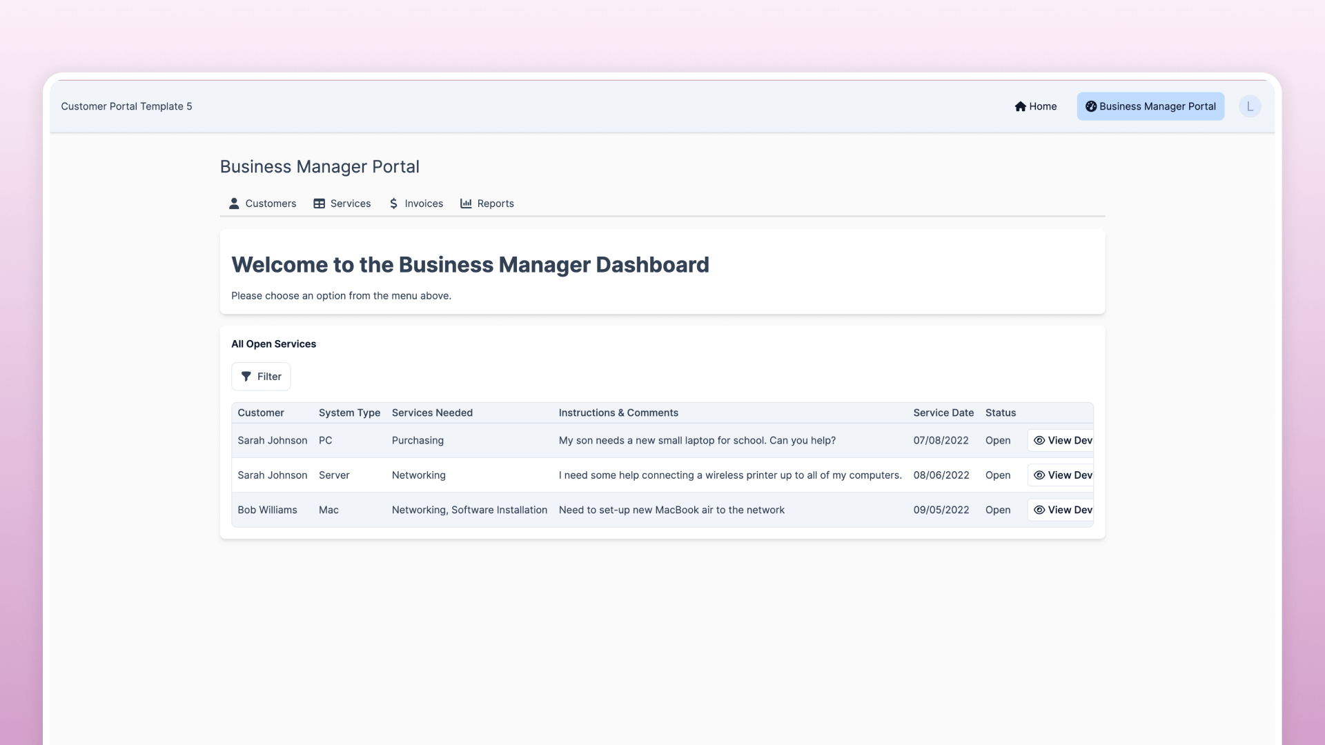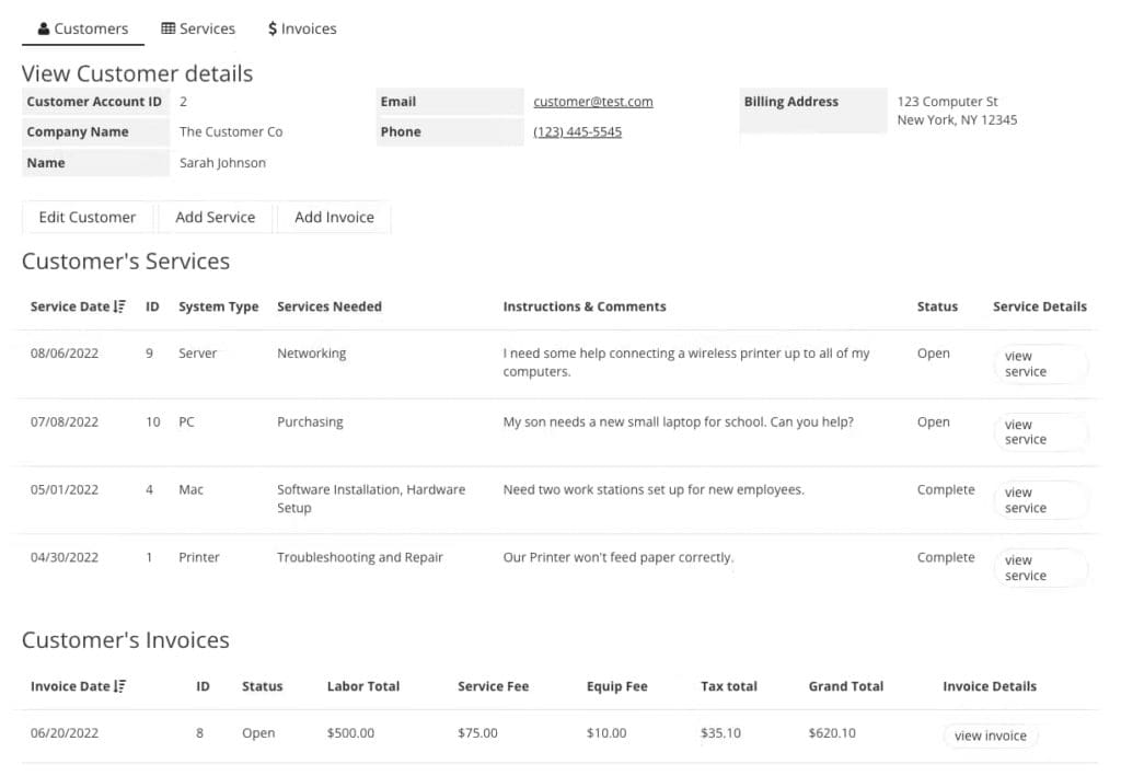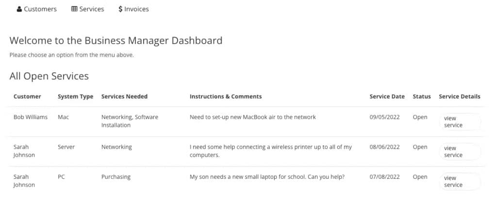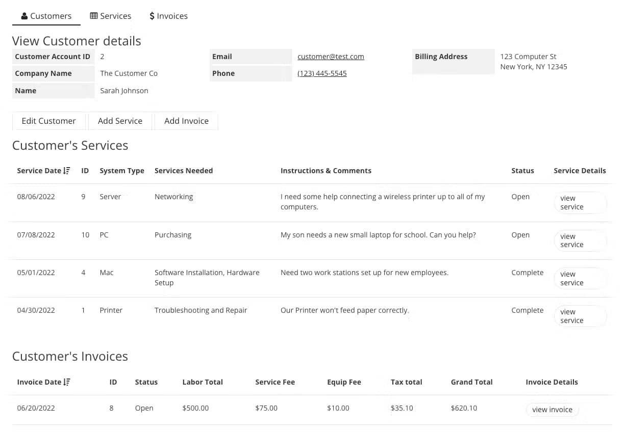 The template supports automated messaging and notifications, which can be set up to notify internal team members of new service requests or remind customers of upcoming invoice due dates.
