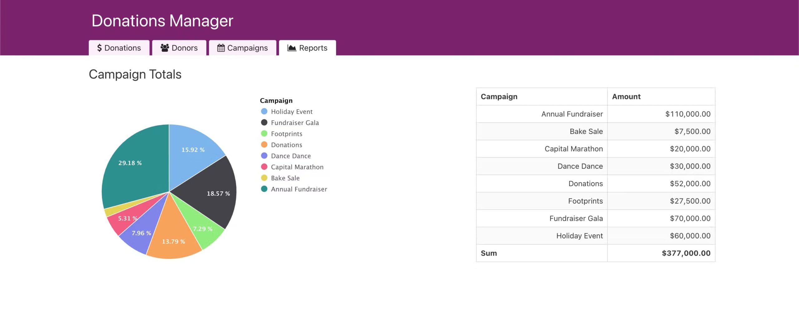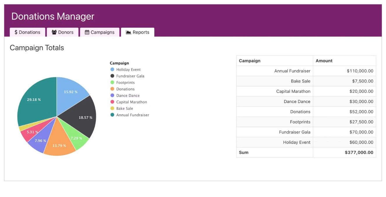 - Donation reports – View percentage of donations by campaign, donations per month, and much more.