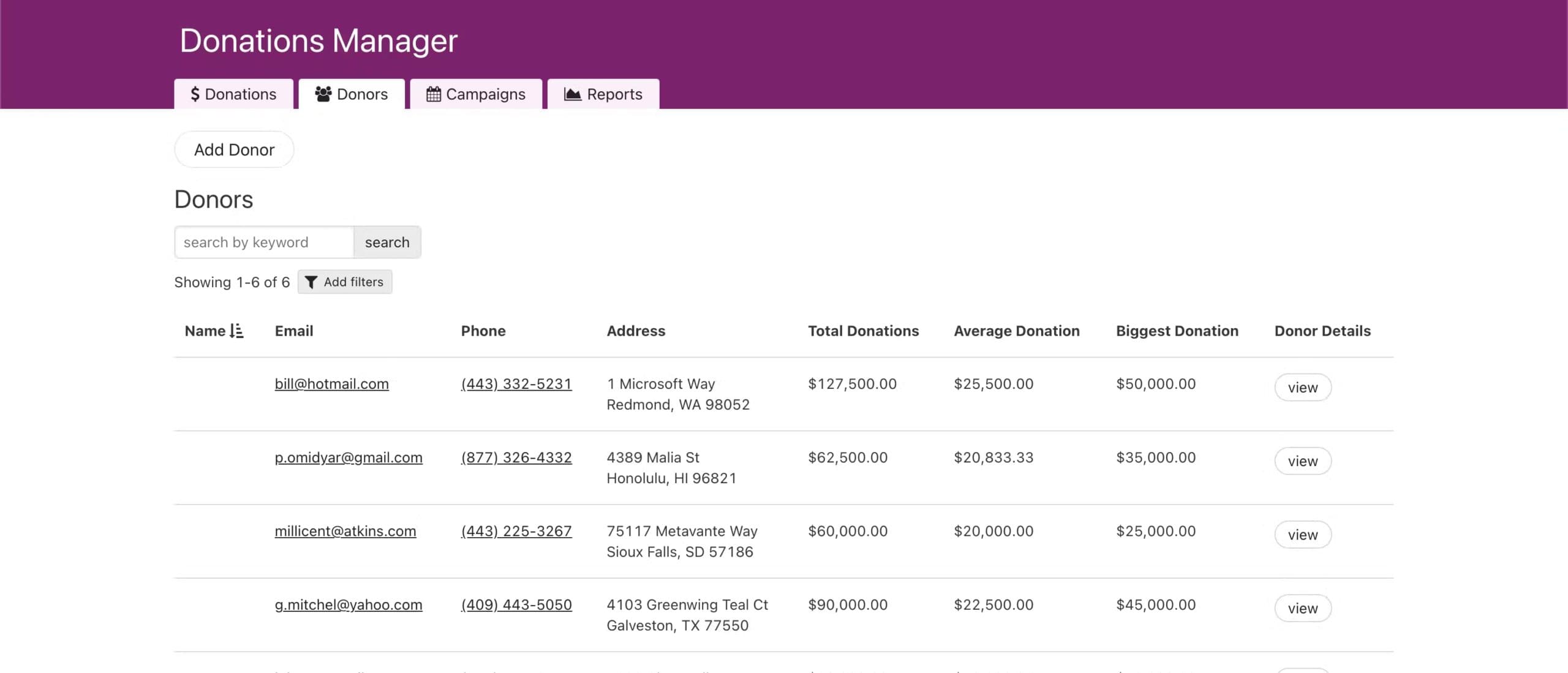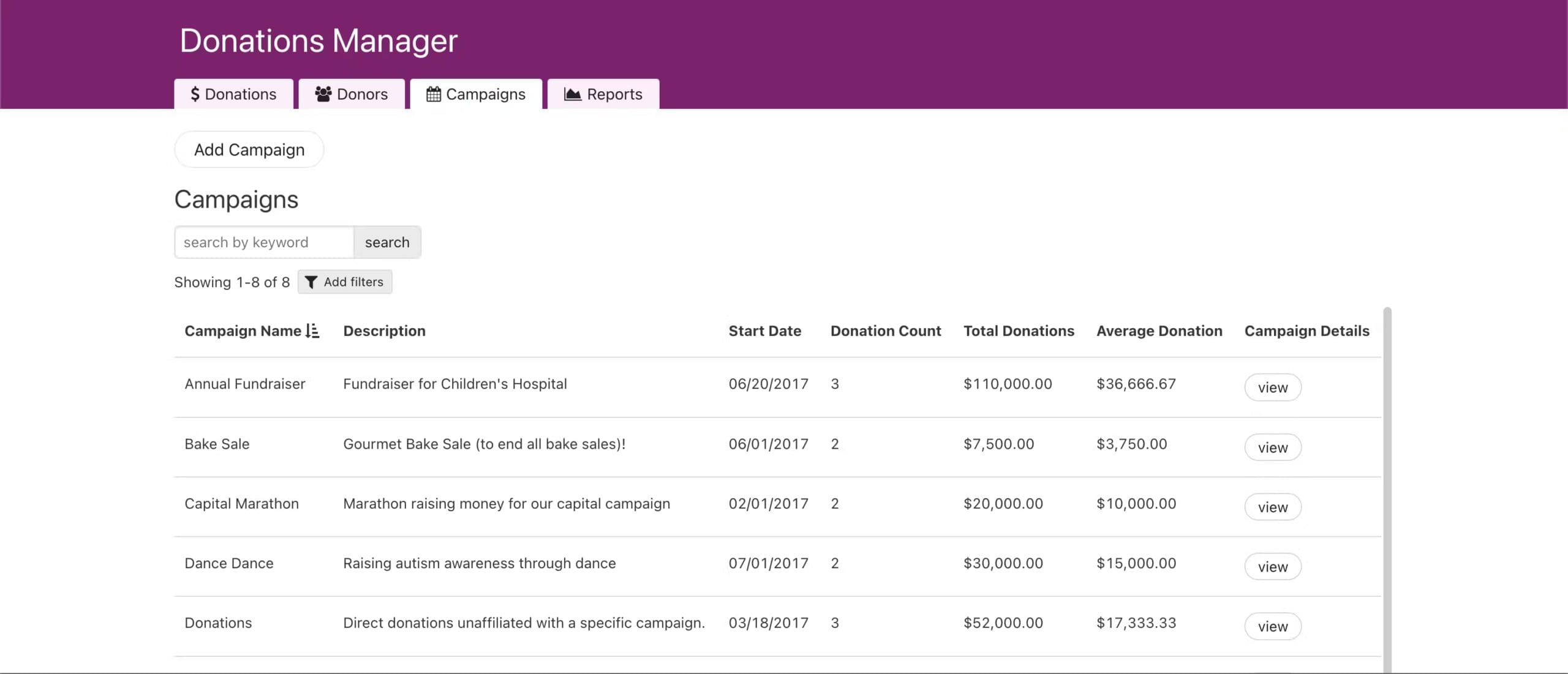 - Easy stats – Each donor and campaign automatically calculates total donations, average donation, and the min/max donations.