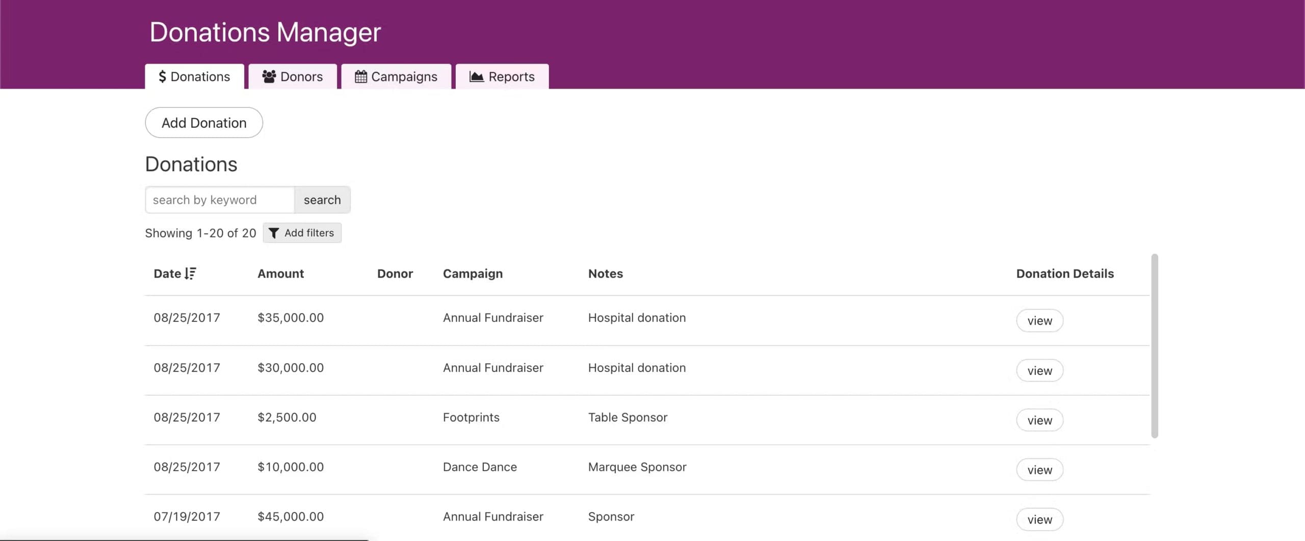 - Historical donations – See the donations each donor has made over time.