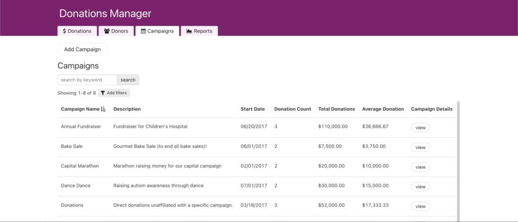 Donation management makes it easy to track your donations, donors, and campaigns.