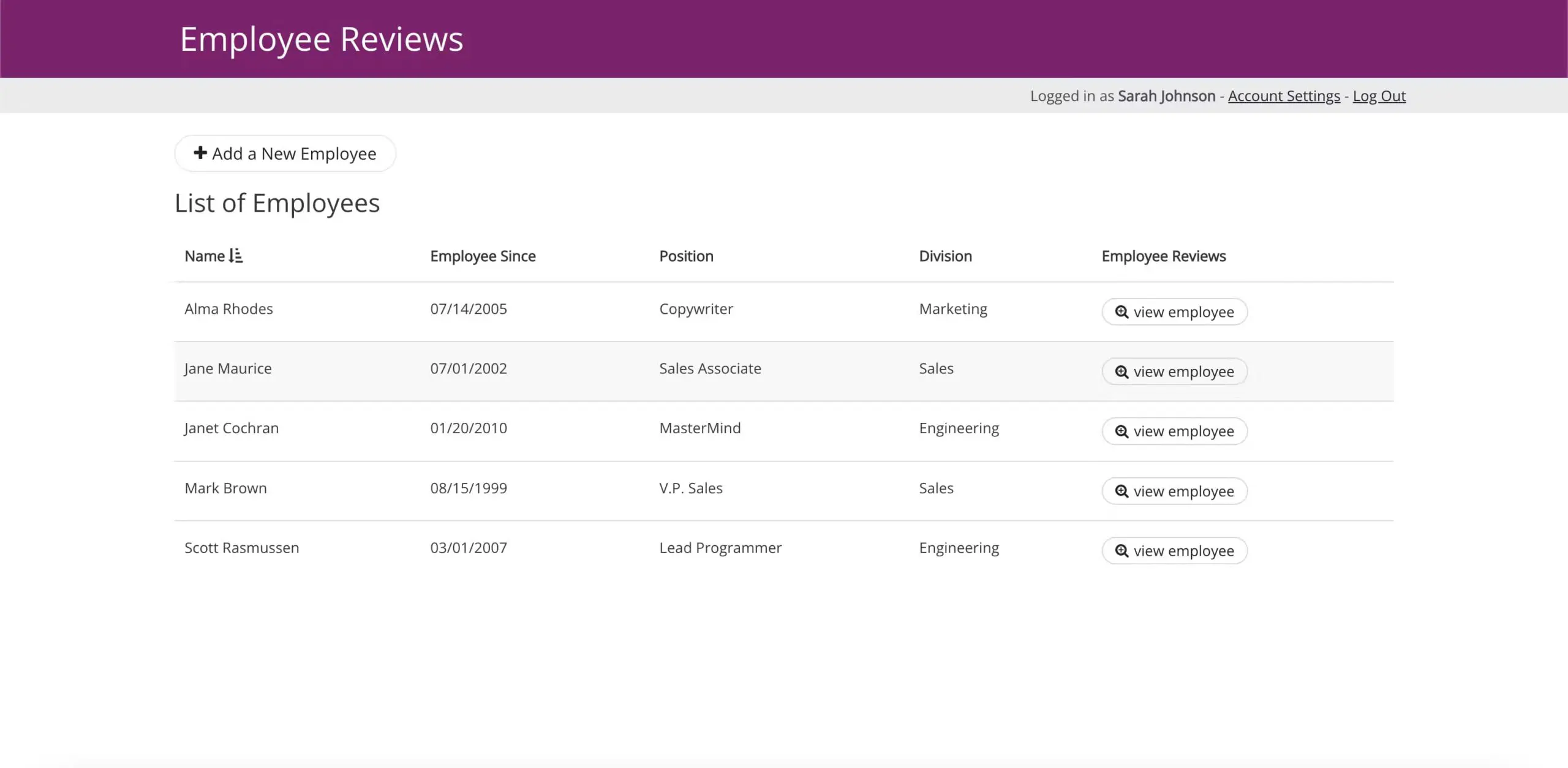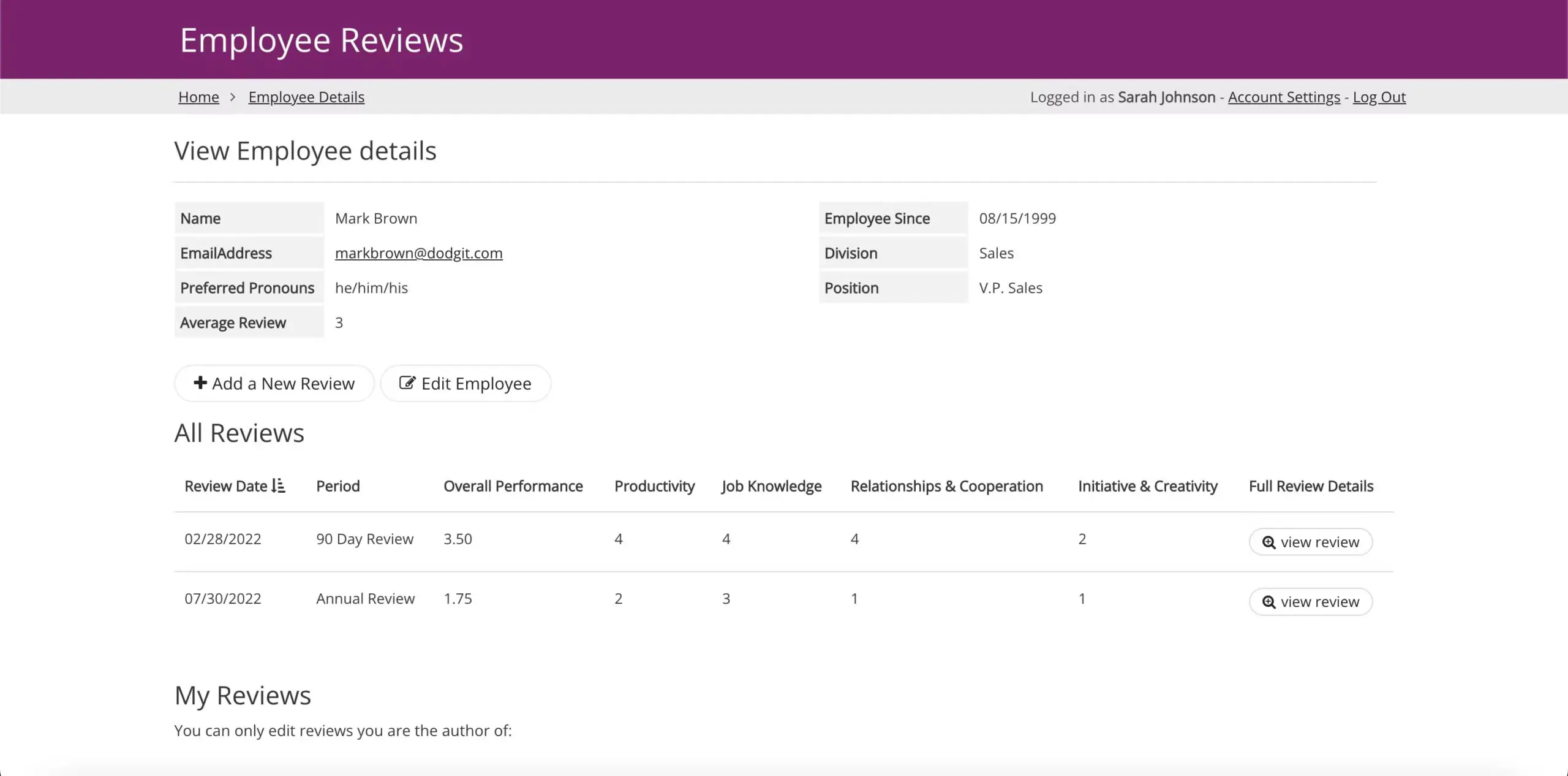 This employee review demo includes a password-protected area that allows HR staff and managers to add performance details and summaries from quarterly or yearly employee reviews.