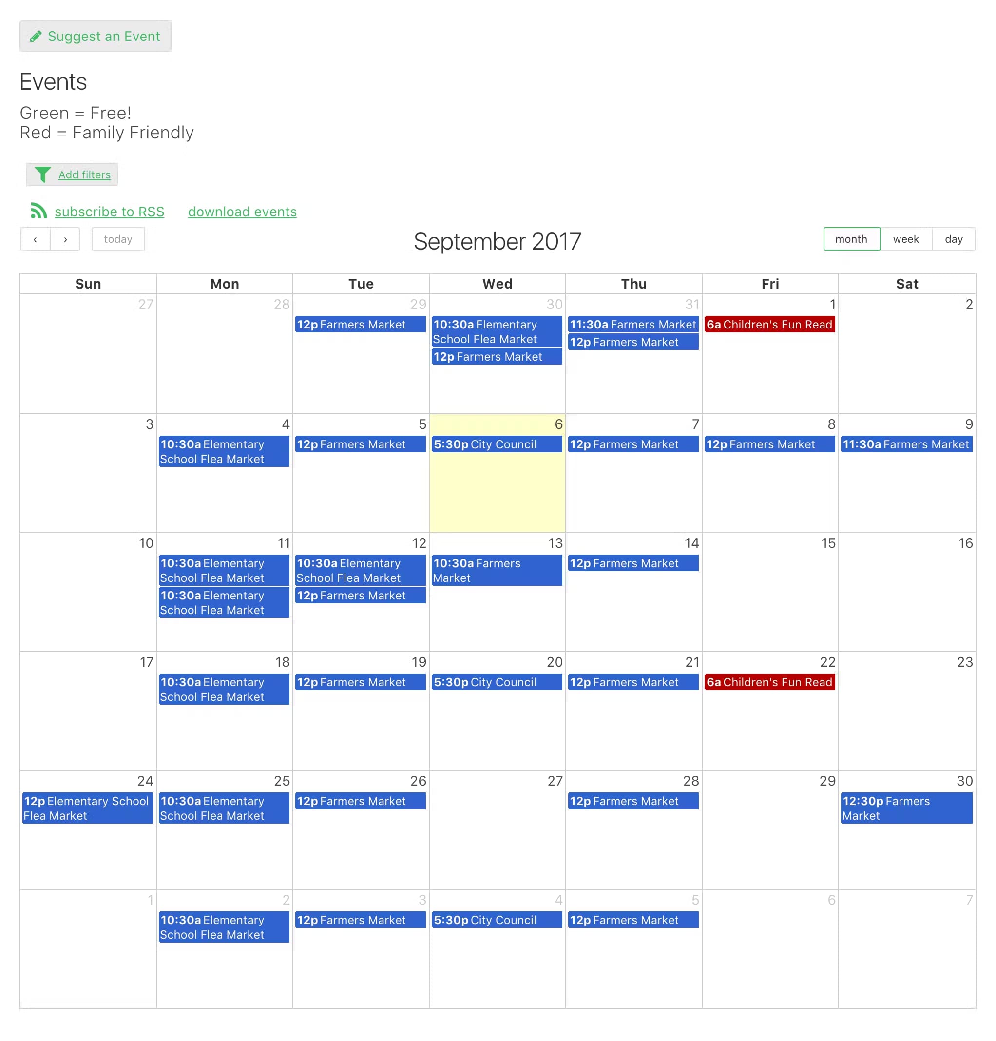 This calendar can be embedded right into your website. Events can be filtered, categorized, and color-coded. The community submits their own events for approval.