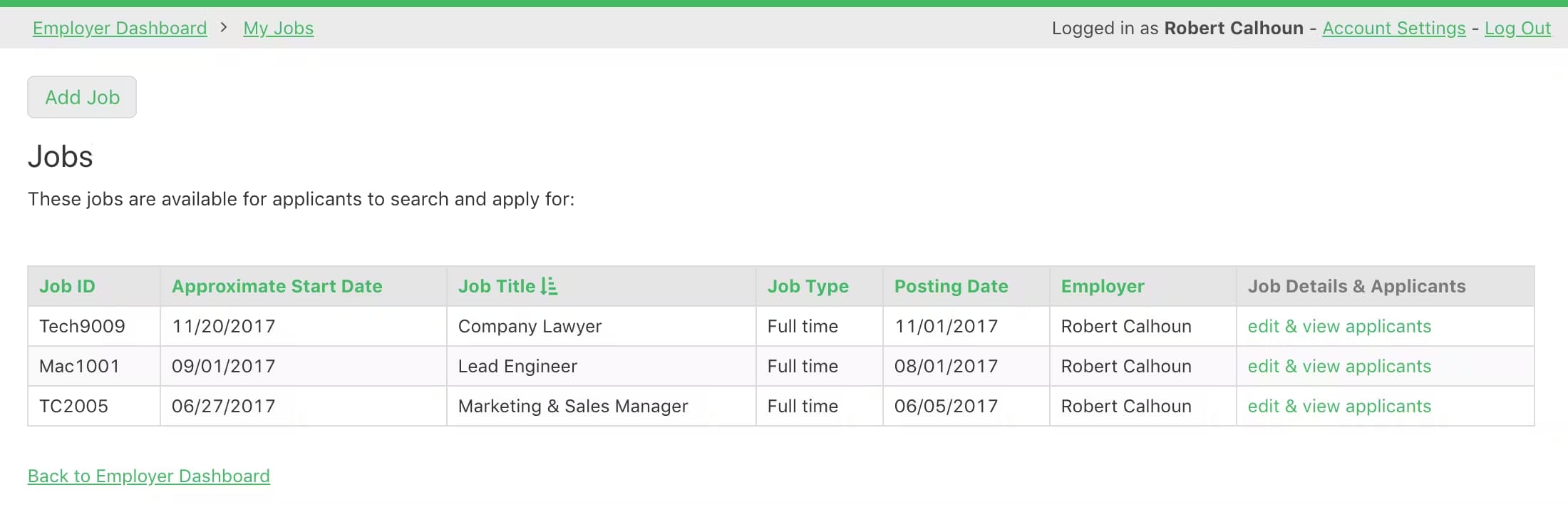 This job portal app helps match employers with applicants. Employers login and add available jobs, view any applicants that have applied, and search applicants for contact information.