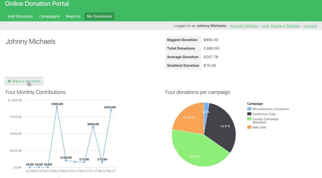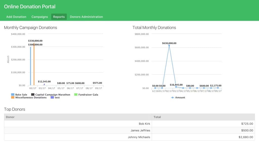 - Donation reports – View percentage of donations by campaign, donations per month, and much more.