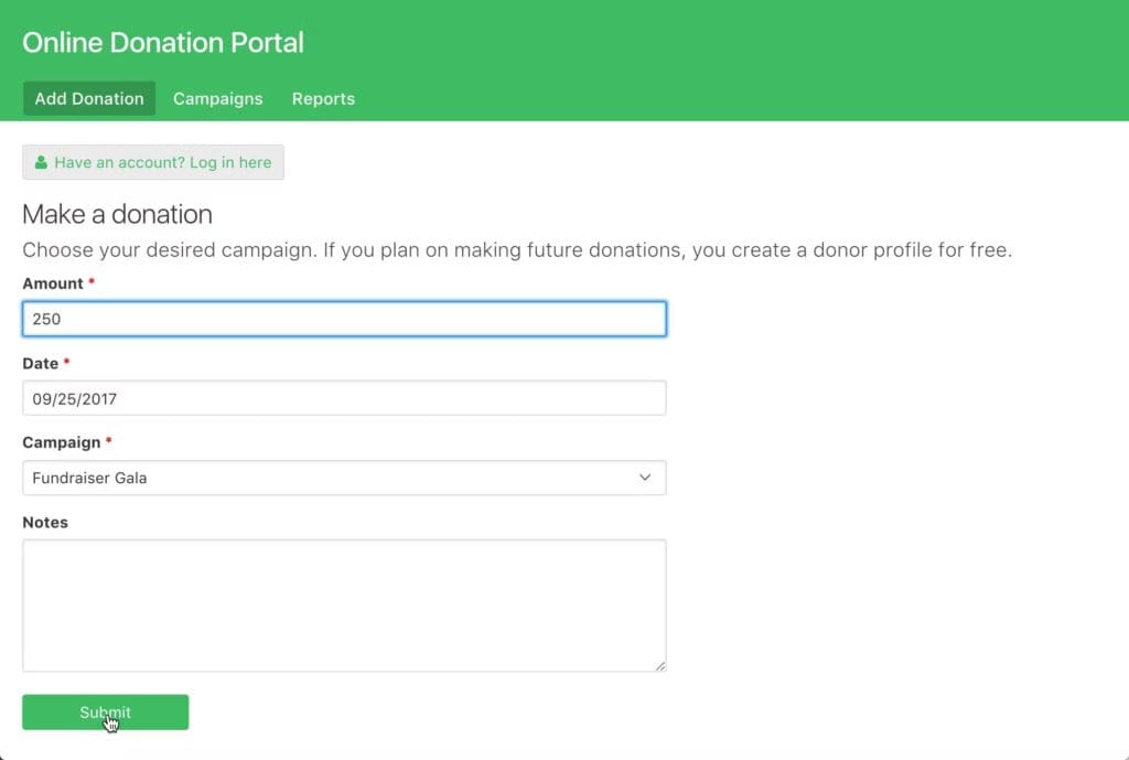 - Donor profiles – Donors can create an account so they can track past donations and access personalized reports.