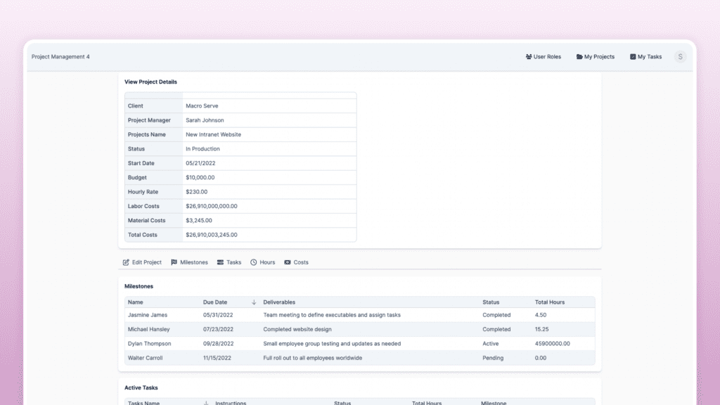 - Team integration – Assign tasks to your team so they can log in and complete project milestones.