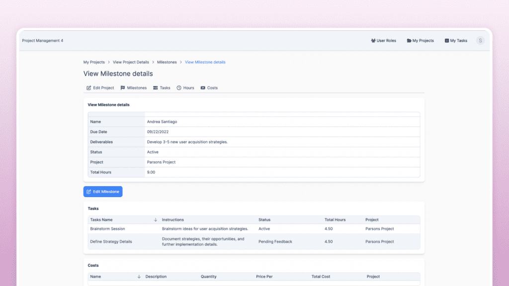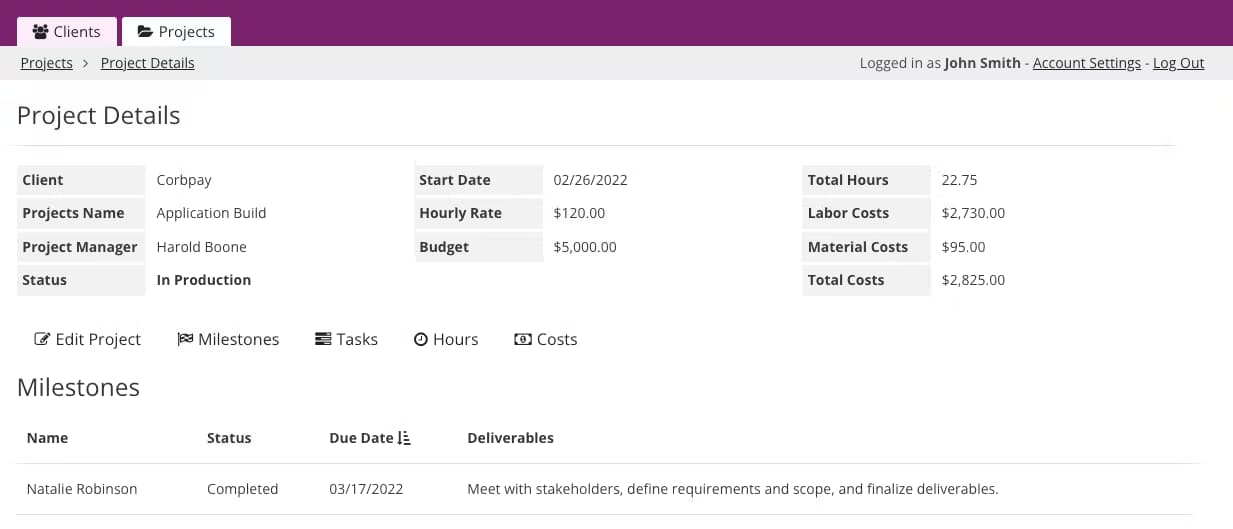 - Easy stats – Each project and milestone automatically calculates total costs and expenses and tracks deadlines.