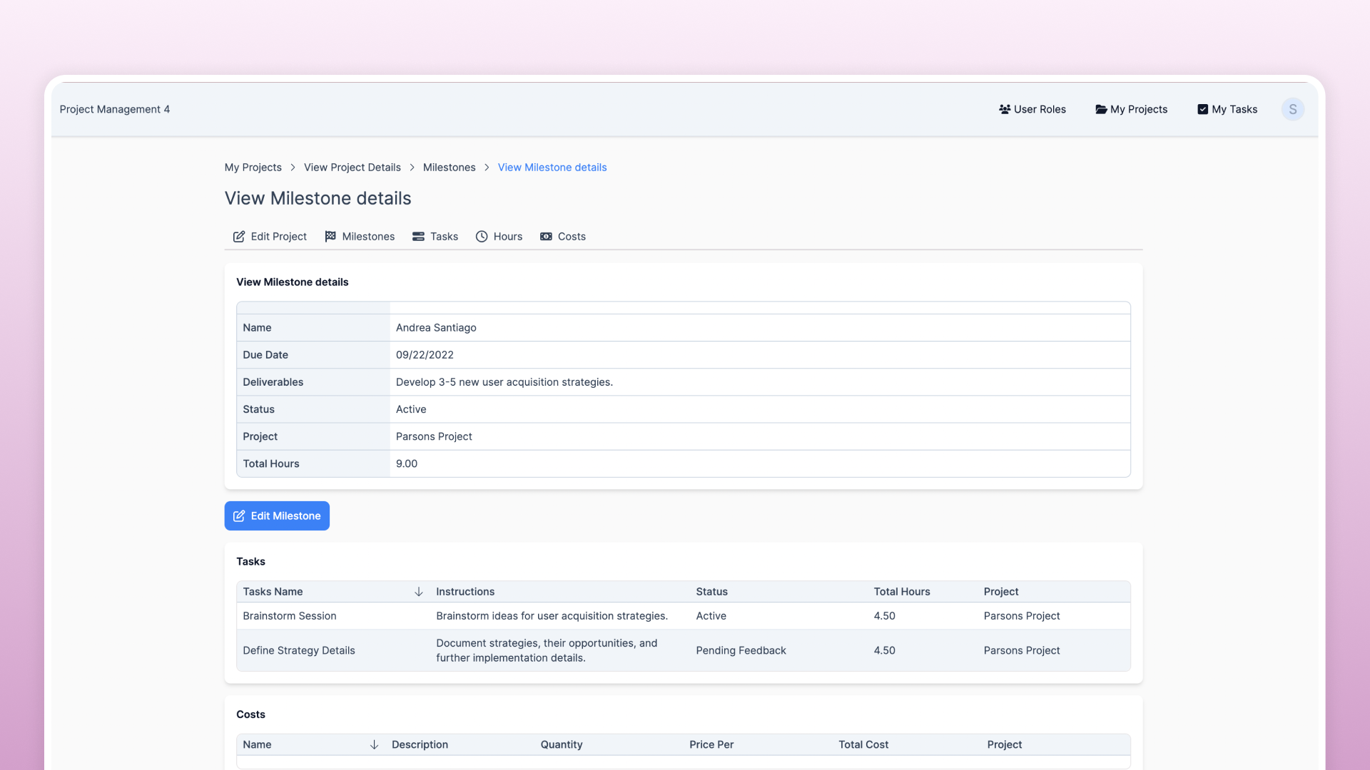 This project management app tracks projects, including milestones, tasks, hours, costs, and more.