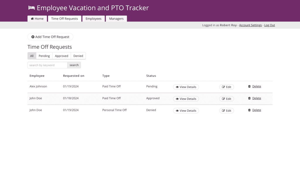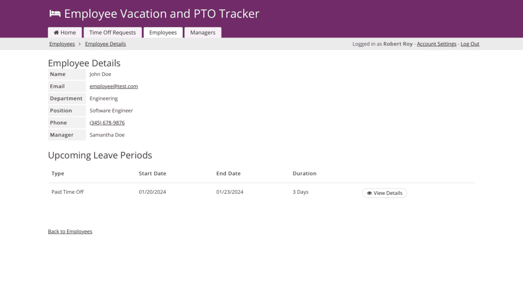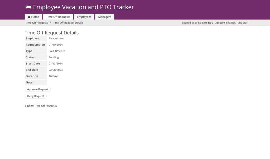 It’s designed for three main groups: regular employees, managers, and HR administrators. Employees just log in and request time off by filling in a few details, like when they need off and why. Team members can also access their vacation days accruals. Managers use the app to track employee time off requests, check if it works with the team’s schedule, and then approve or deny it. Managers can also track employee absences that may occur unexpectedly, like sick leave. HR Managers handle the behind-the-scenes, like setting up accounts and making sure everything follows the rules, including time off policies.