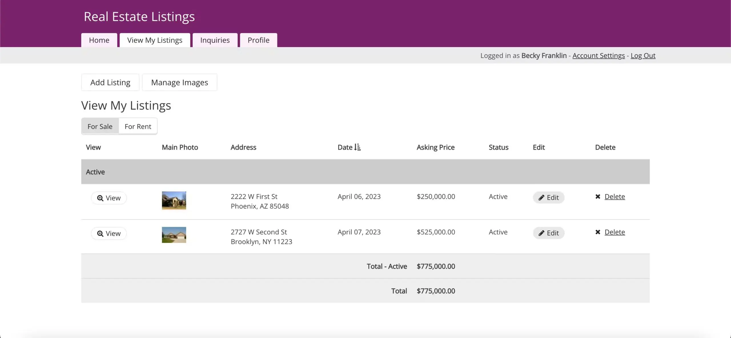 In this real estate app, both realtors and brokers log in to manage listings. They can add and edit listings and add images to each listing’s gallery. Brokers manage all listings. Agents only manage their own listings.