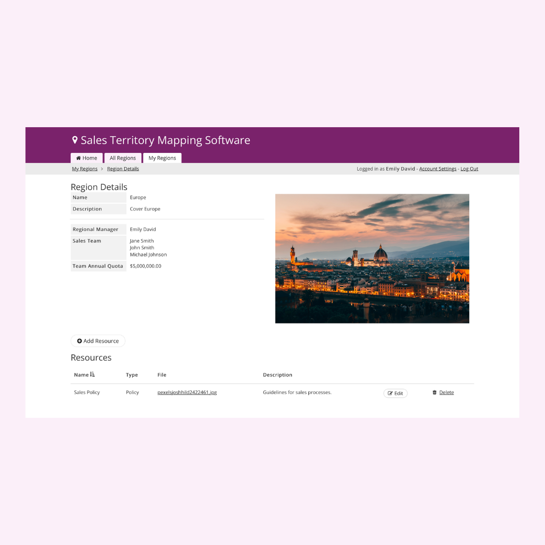 - Create and Manage Territories: Create, edit, and delete sales territories. Assign sales representatives to specific territories. Visualize territories on interactive maps.