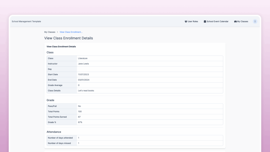 - Comprehensive School Management: Knack’s school management software template app offers an all-in-one solution, allowing schools to efficiently handle student data, attendance tracking, report cards, and more in a single platform.