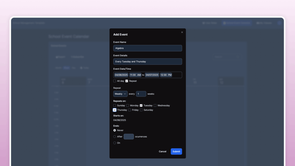 - Event Planning: Calendar facilitates seamless coordination by providing a visual overview of classes, events, and deadlines, enhancing organizational efficiency for teachers, parents, and students.