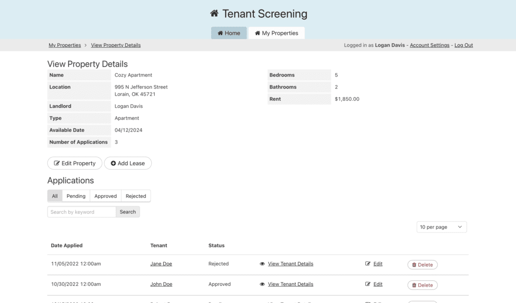 - Tenant Screening: Integrated access to credit, background, and employment checks, with a landlord dashboard for reviewing and managing applications.