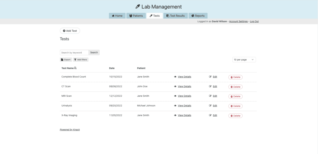 - Test Sample Management: Store details of various tests available in the lab, facilitating easy organization, reference, and sample tracking.