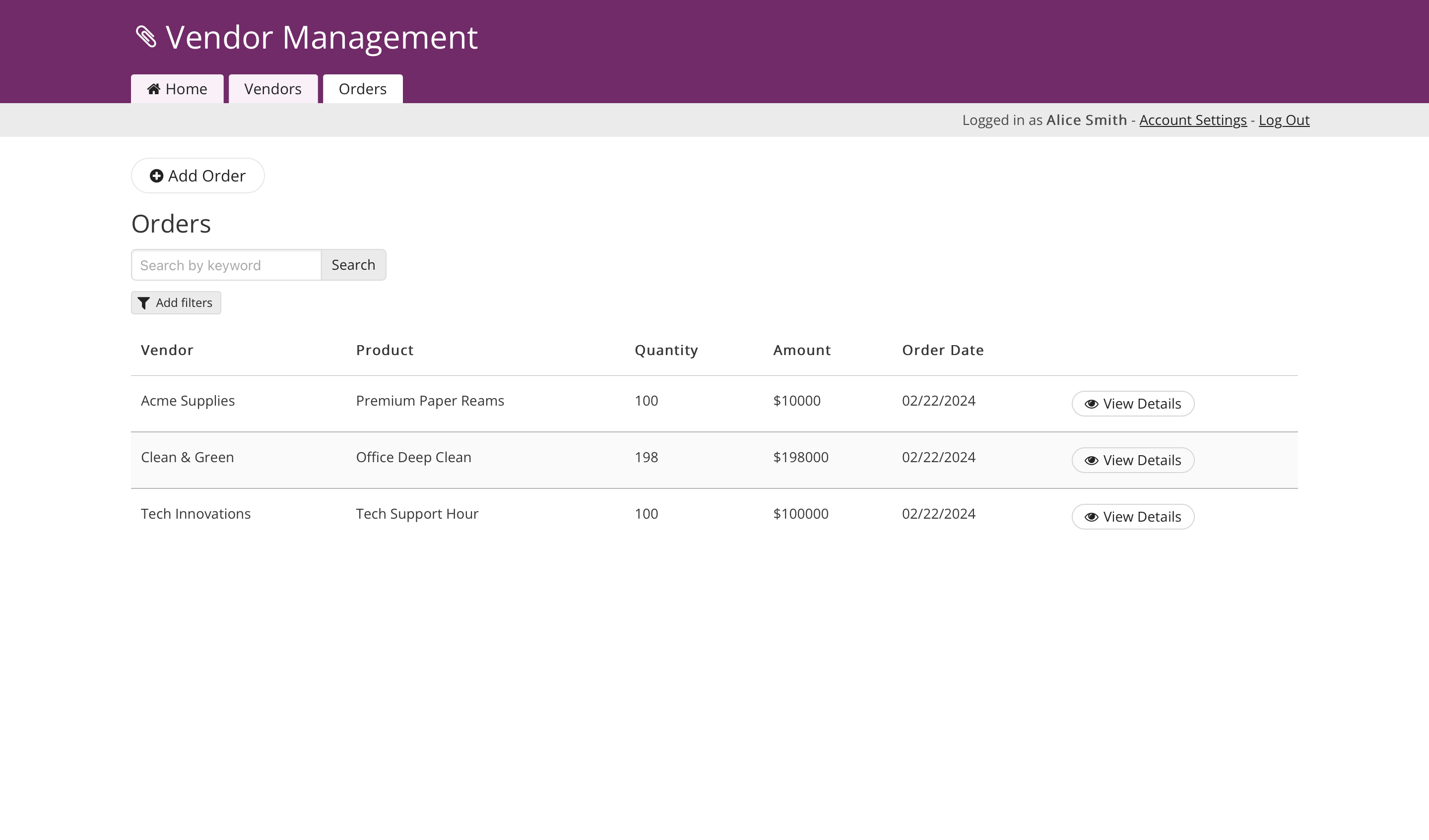 - Order Management: Provides functionality to create, track, and manage purchase orders placed with vendors, including transaction dates, products/services ordered, and order status.