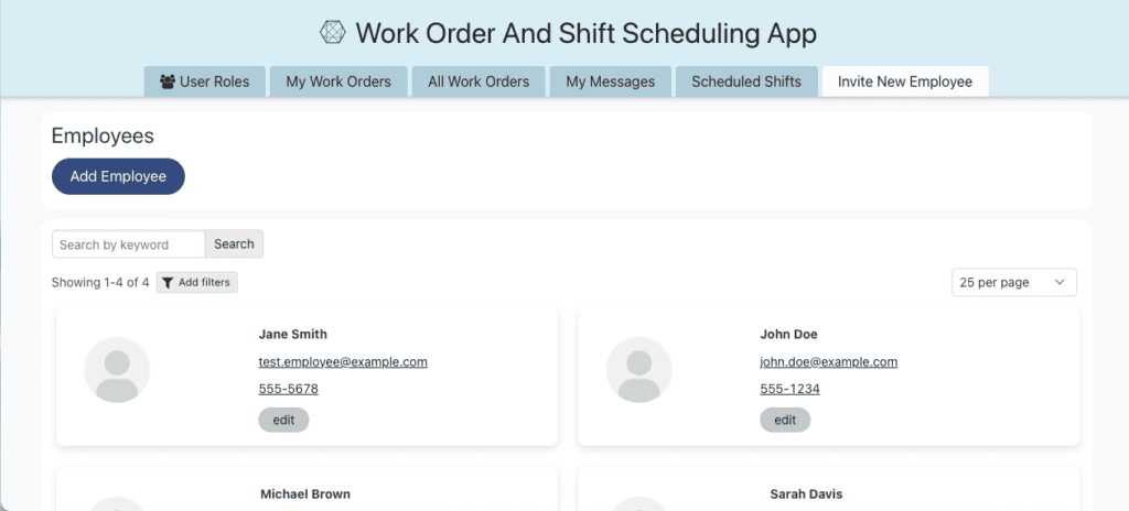 Offers dedicated pages for inviting new employees, managing existing team members, and editing their contact information. Includes a search function for quick access to specific team members.