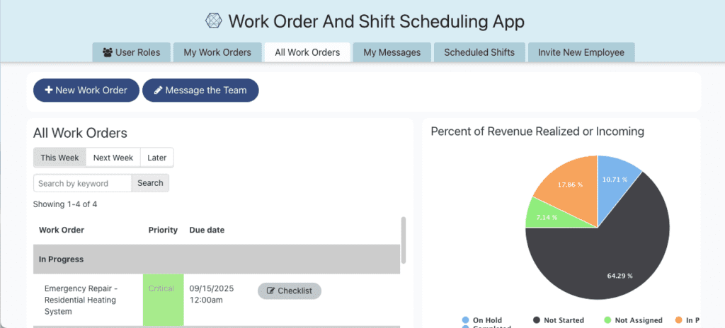 Displays pie charts and data visualizations to monitor work order progress, categorize priorities, and analyze revenue realized or incoming from completed jobs.